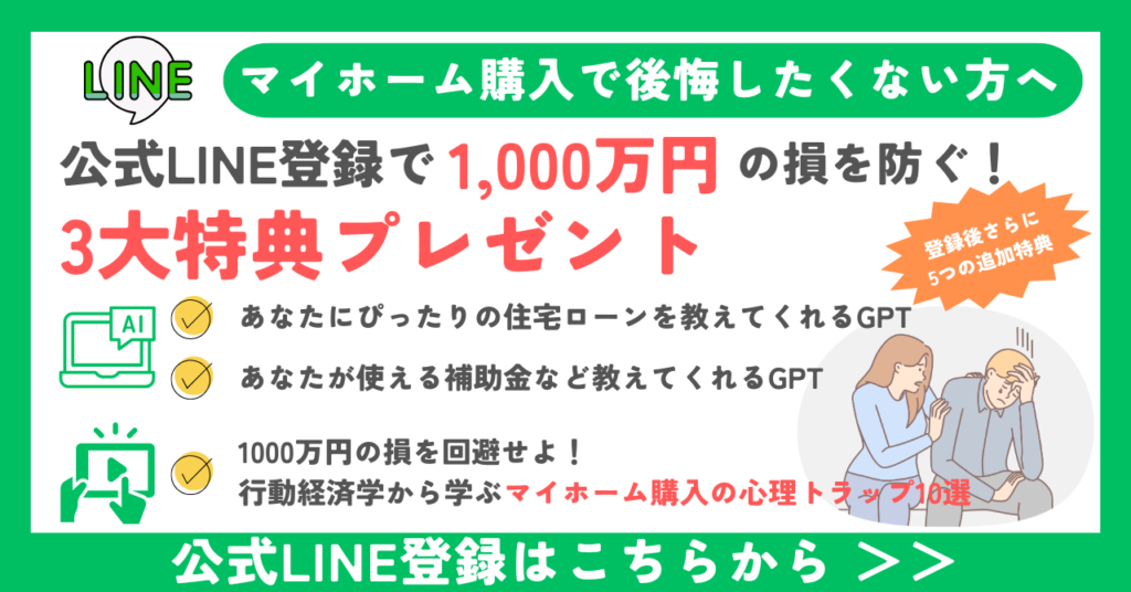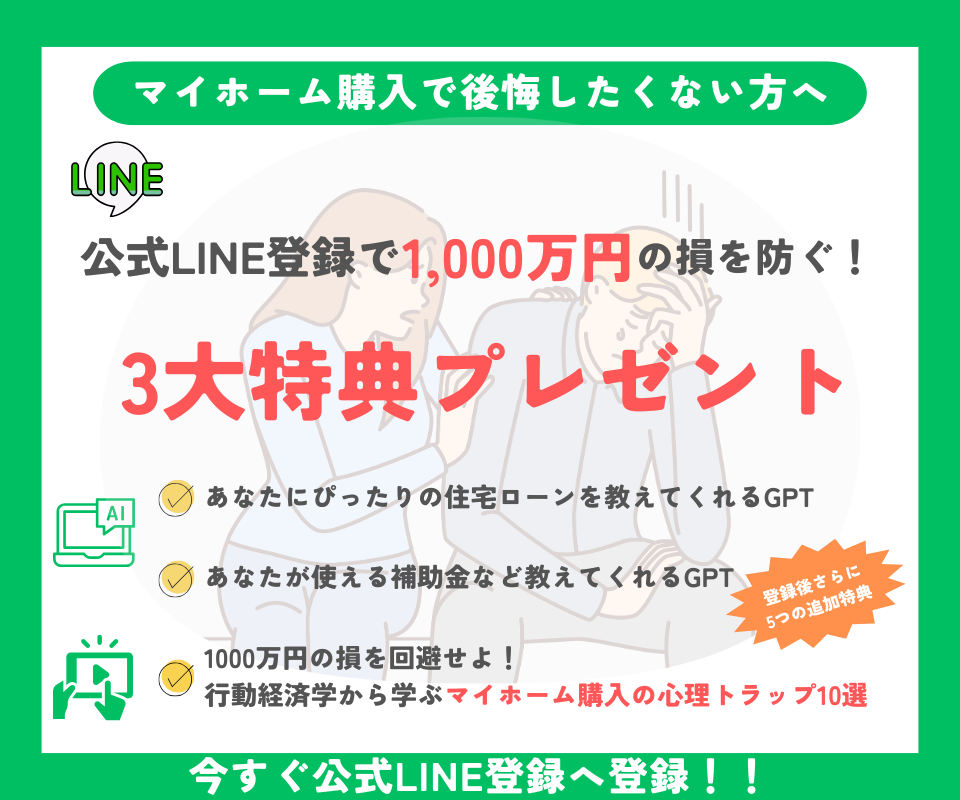 公式LINEへご登録 ⇒ お問い合わせの場合、マイホーム購入に役立つ豪華3大特典をプレゼント!