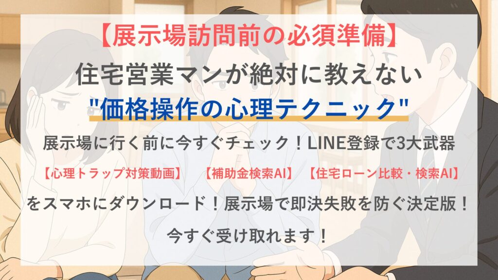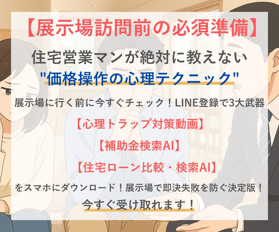 だからこそ、住宅展示場に行く前に必ず知っておくべき「心理トラップ対策動画」と「マイホーム購入専門FP監修GPTツール」を、このLINEから完全無料でお届けします。
