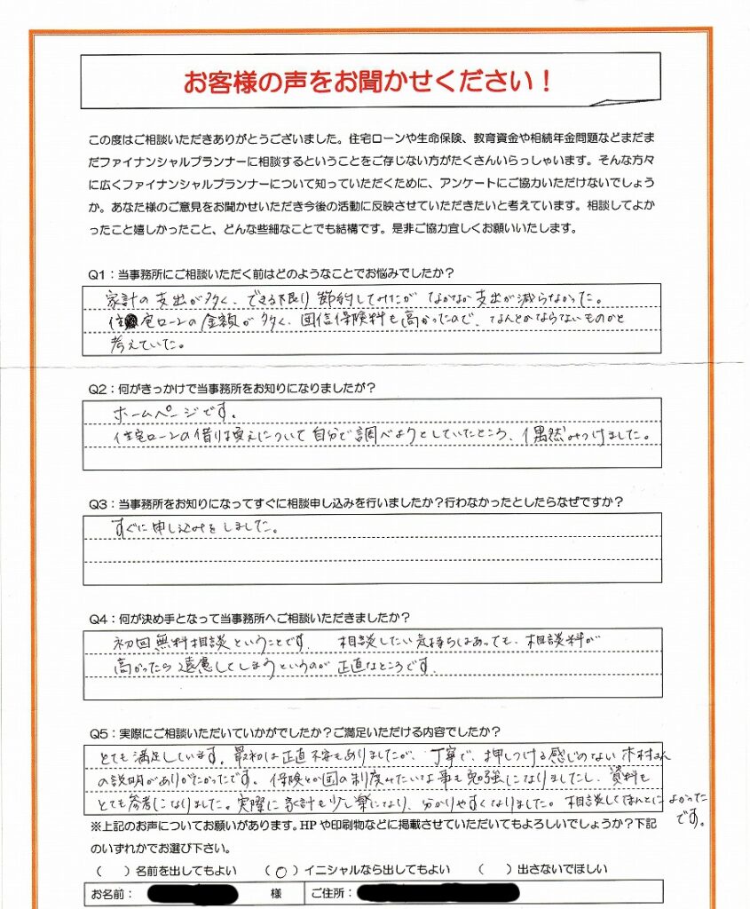 ご夫婦ともに公務員さんで収入は安定していますが、それ故に何とかなる家計にありがちで無駄が多い印象でした。支出や保険を見直し住宅ローンを返済してもきちんと貯蓄が出来る家計にまずは改善し、お金の不安を無くしました。