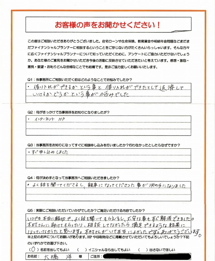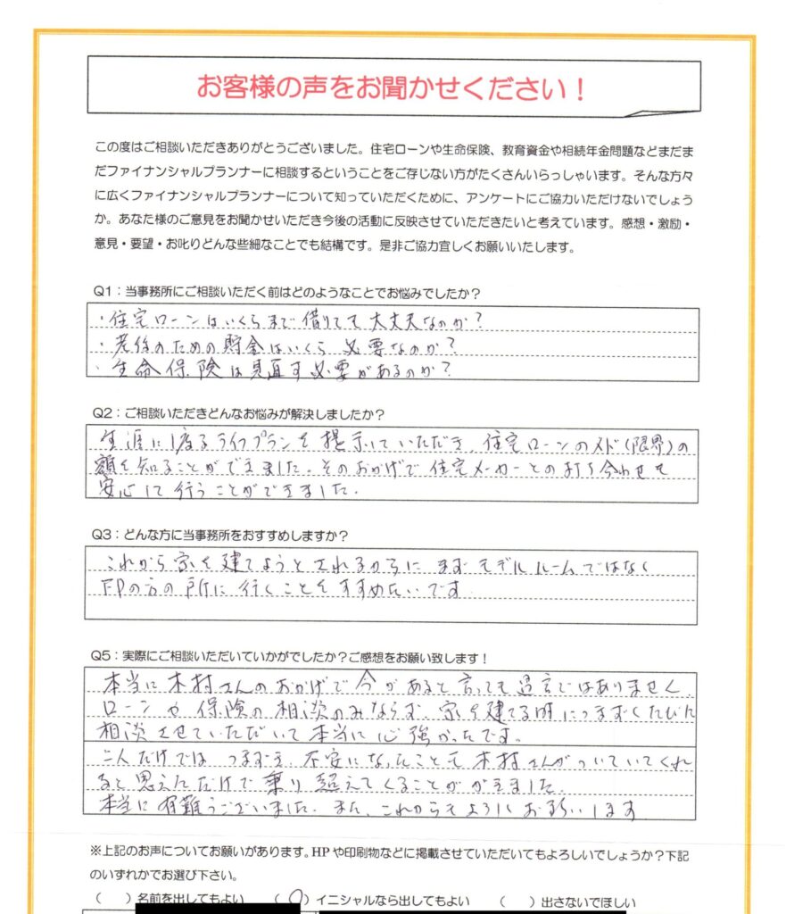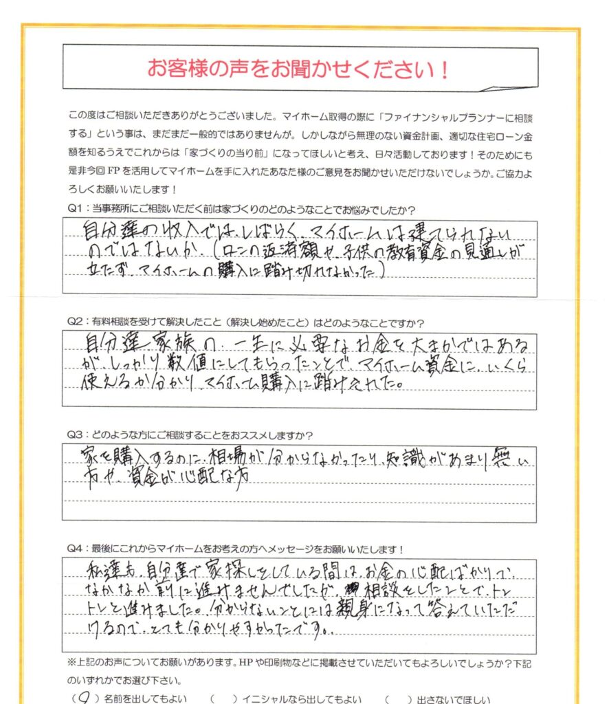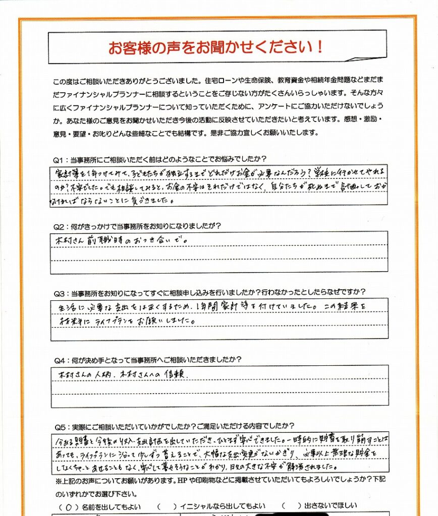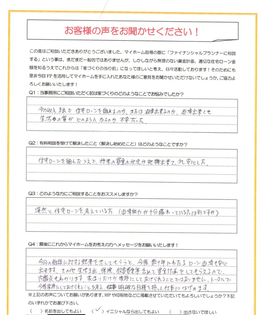 家計簿をしっかりとつけていても、中々将来のお金の流れまでは見えてこないため、奥様はご不安のようでしたが、今回お手伝いさせていただいたことでより将来の目標や具体的数字が見え安心して家計運営ができると大変喜んでいただきました。