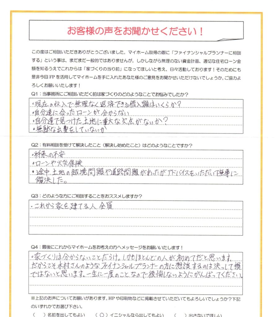ご不安もなくなり安心・安全なマイホーム資金計画のもとご新築されご家族笑顔で自然素材をふんだんに使用したお宅で生活されています!